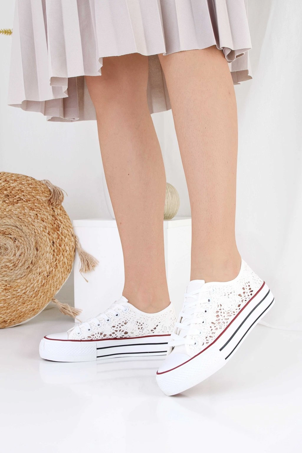 Białe trampki na podwyższonej platformie z efektowną, koronkową cholewką. Klasyczne sznurowanie pozwala dobrze dopasować but do stopy i podkreśla sportowy styl. Grubsza podeszwa z wyraźnymi paskami dodaje kilku centymetrów i nadaje całości modnego charakteru. Ażurowa faktura sprawia, że buty prezentują się lekko i wyróżniają się w stylizacjach na co dzień. To wygodny wybór do sukienek, szortów i jeansów, gdy chcesz połączyć casual z subtelną elegancją.