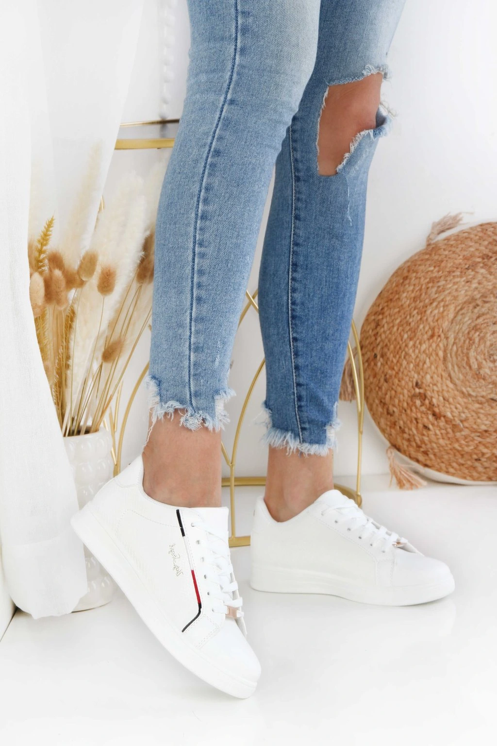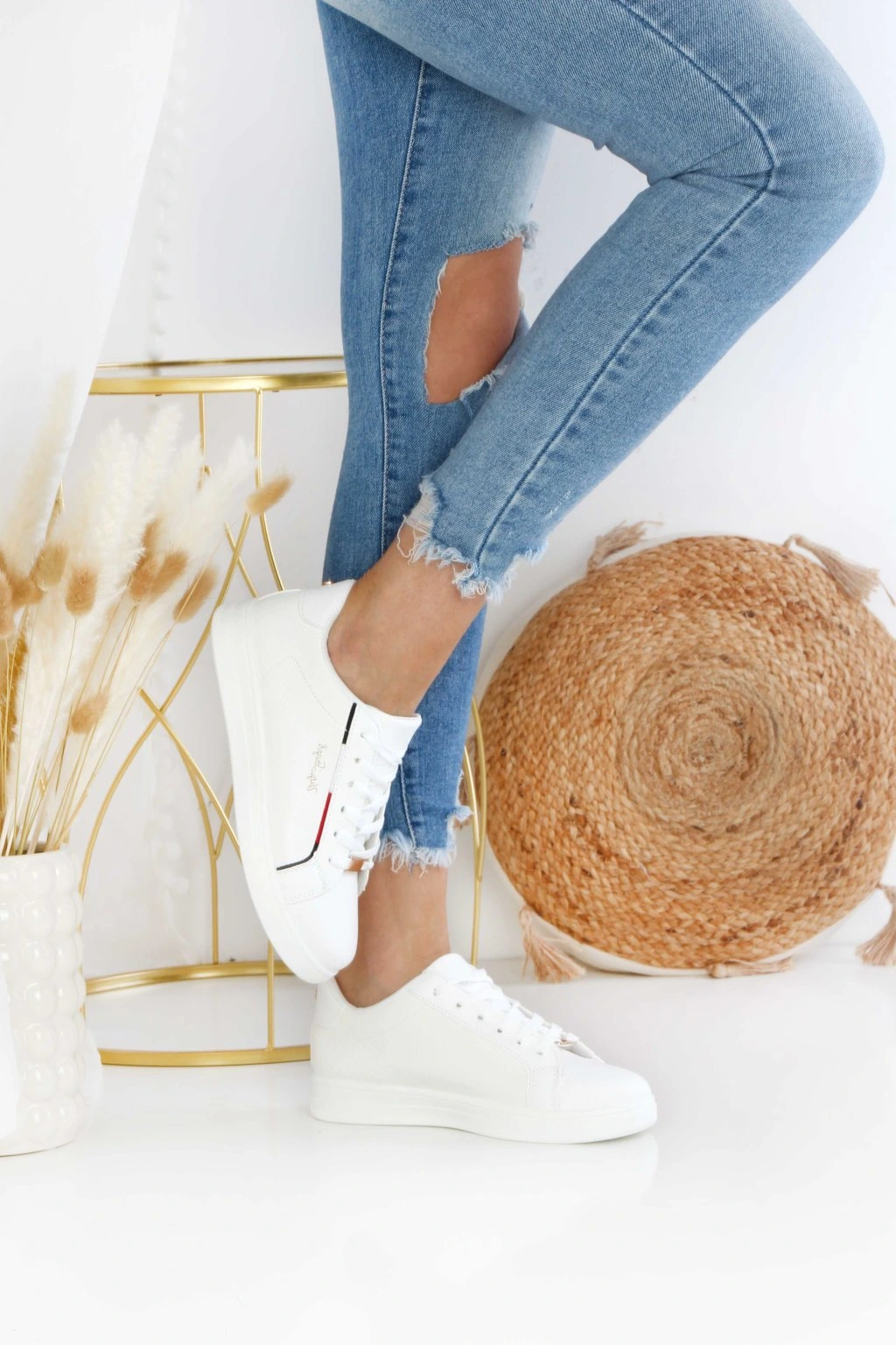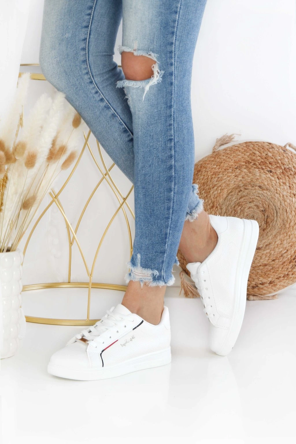 Białe tenisówki o minimalistycznym, miejskim charakterze to uniwersalny wybór do codziennych stylizacji. Model ma sznurowanie, które pozwala dobrze dopasować but do stopy. Grubsza podeszwa typu platforma dodaje nowoczesnego wyglądu i optycznie wydłuża sylwetkę. Z boku widoczne są subtelne ozdobne paski w kontrastowych kolorach, które przełamują gładką cholewkę. To wygodne obuwie na co dzień, które świetnie pasuje zarówno do jeansów, jak i sukienek.