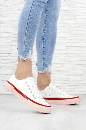 Te płócienne trampki to klasyczny, codzienny model w jasnej kolorystyce. Cholewka jest gładka i wiązana na sznurówki, co pozwala dobrze dopasować but do stopy. Wyróżnia je grubsza gumowa podeszwa w pudrowo-różowym odcieniu oraz czerwony pasek biegnący wzdłuż boku. Niski krój zapewnia swobodę ruchu i pasuje do wielu stylizacji, od jeansów po sukienki. To wygodna propozycja na spacery i lekkie, miejskie aktywności w cieplejsze dni.
