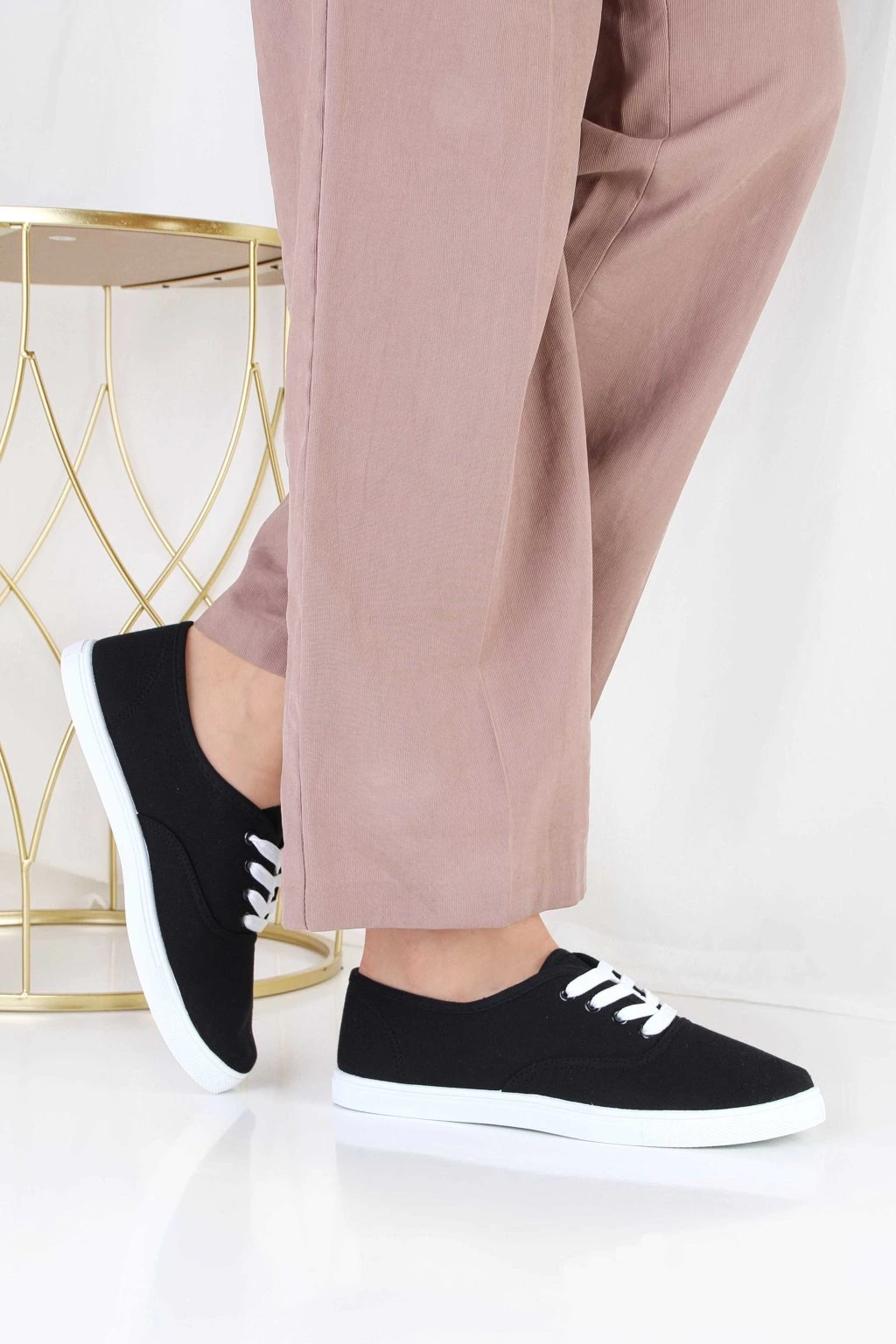 Te czarne tenisówki płócienne to klasyczny model na co dzień. Mają białe sznurówki, które tworzą wyraźny kontrast i podkreślają prosty, uniwersalny styl. Niska cholewka zapewnia swobodę ruchu i dobrze pasuje do wielu stylizacji. Biała podeszwa dodaje lekkości wizualnej i sprawia, że buty wyglądają świeżo i nowocześnie. To wygodna propozycja do casualowych zestawów, takich jak jeansy, spodnie materiałowe czy sukienka.