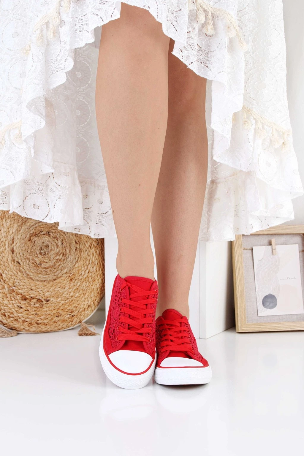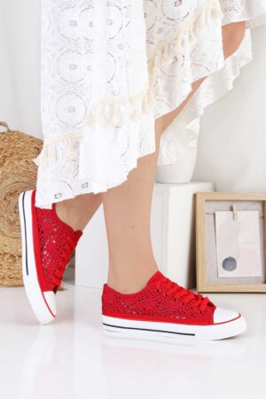 Czerwone trampki z ażurową, koronkową cholewką to lekka propozycja na cieplejsze dni. Model ma klasyczne sznurowanie, które pozwala dobrze dopasować but do stopy. Biała gumowa podeszwa z czarnym paskiem nadaje im sportowy, ponadczasowy charakter. Zaokrąglony, biały nosek nawiązuje do stylu klasycznych trampek i dodaje im wyrazistości. Przewiewna struktura materiału sprawia, że buty prezentują się subtelnie i świetnie pasują do letnich stylizacji.