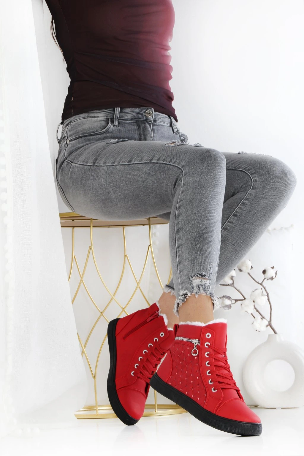 Czerwone ocieplane trampki za kostkę to świetny wybór na chłodniejsze dni. Model ma sznurowanie z metalowymi oczkami oraz dodatkowy zamek z boku, który ułatwia zakładanie. Wnętrze wykończone jest miękkim ociepleniem widocznym przy cholewce. Czarna podeszwa dodaje kontrastu i sprawia, że buty wyglądają nowocześnie. Boczne przeszycia i drobne zdobienia podkreślają casualowy charakter obuwia.