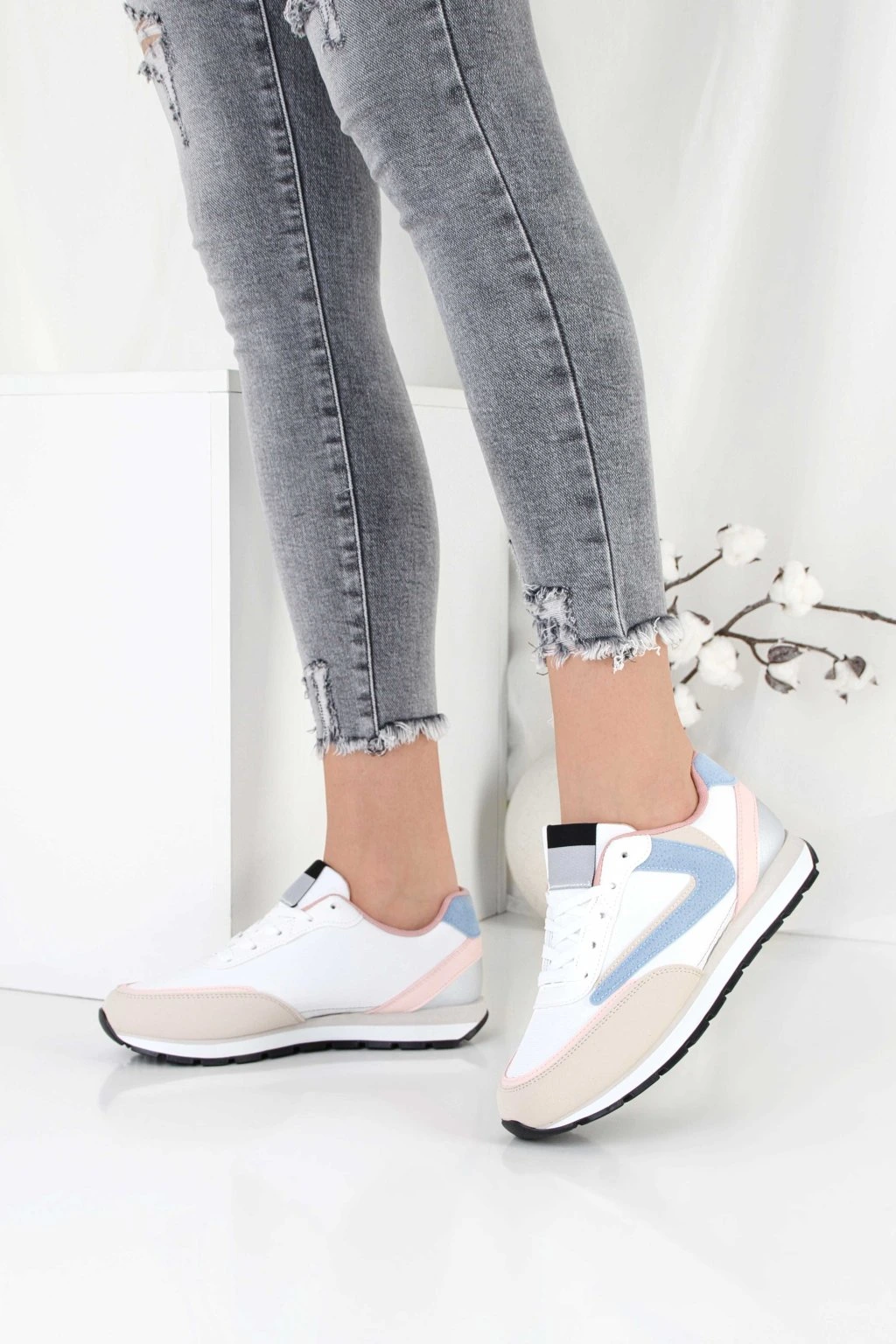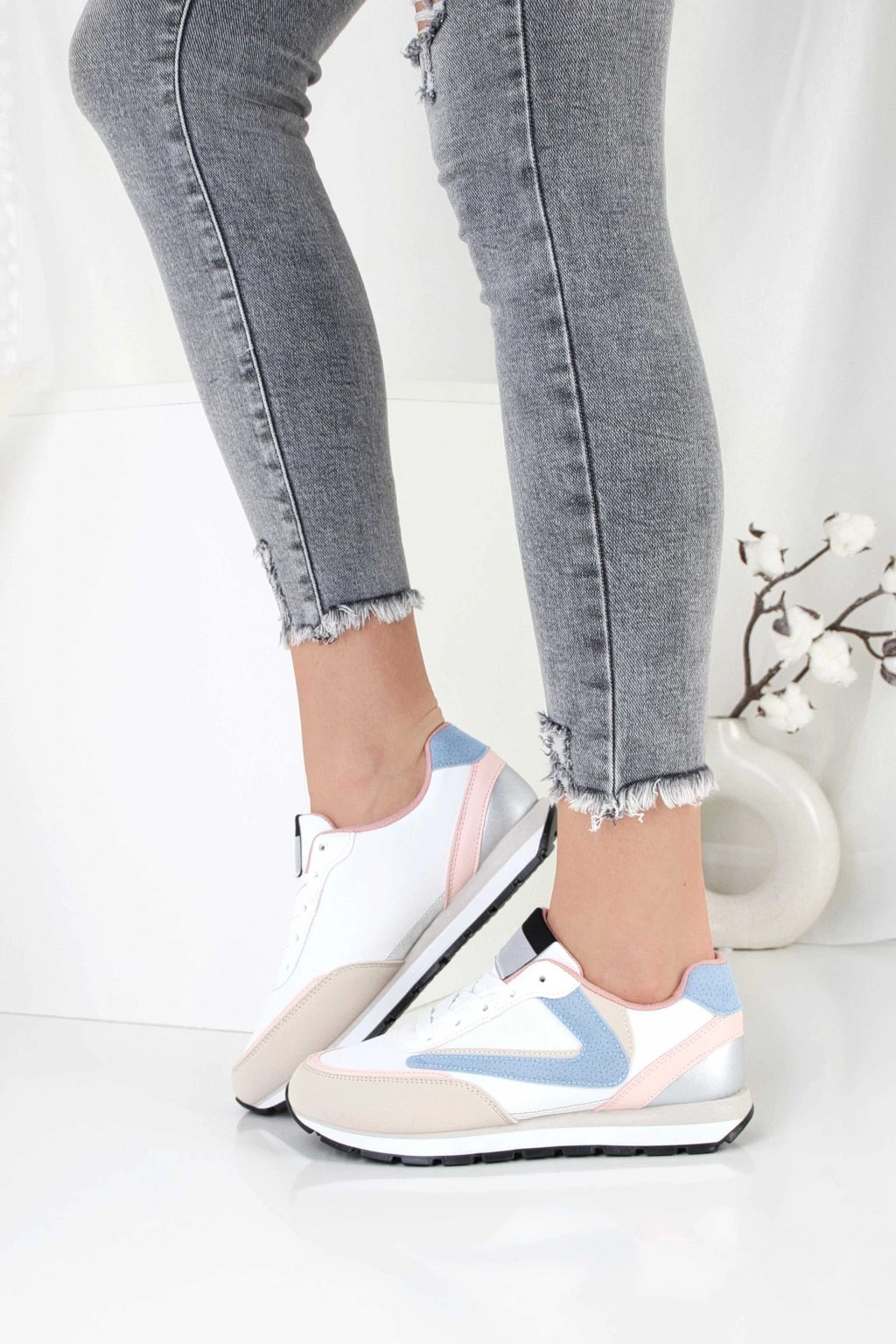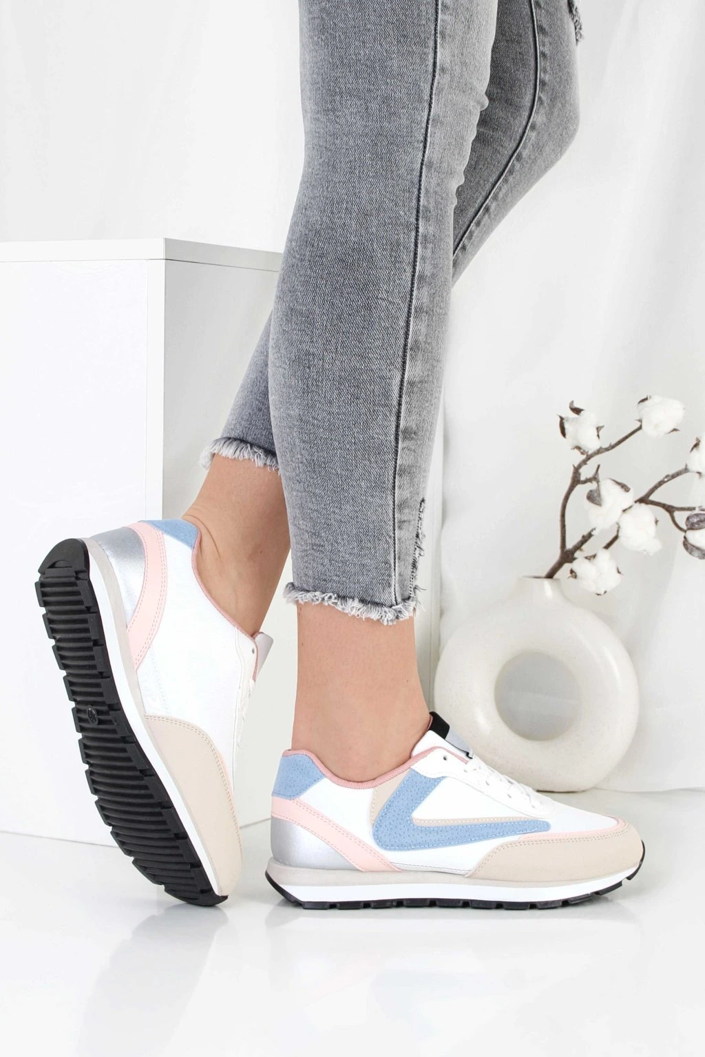 Te damskie sneakersy to stylowe połączenie bieli z beżowymi i pastelowymi akcentami. Model ma klasyczne sznurowanie, które pozwala dobrze dopasować but do stopy. Cholewka utrzymana jest w sportowym stylu, a kontrastowe wstawki dodają całości nowoczesnego charakteru. Grubsza podeszwa z wyraźnym bieżnikiem zapewnia stabilny krok i dobrą przyczepność. To uniwersalne obuwie na co dzień, które łatwo zestawisz z jeansami i casualowymi stylizacjami.