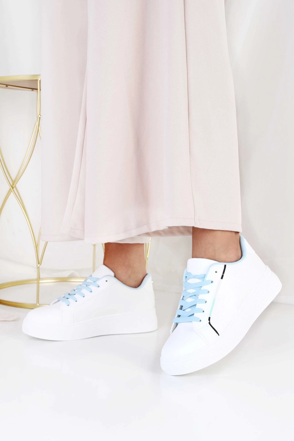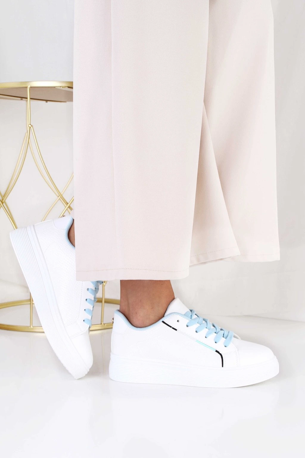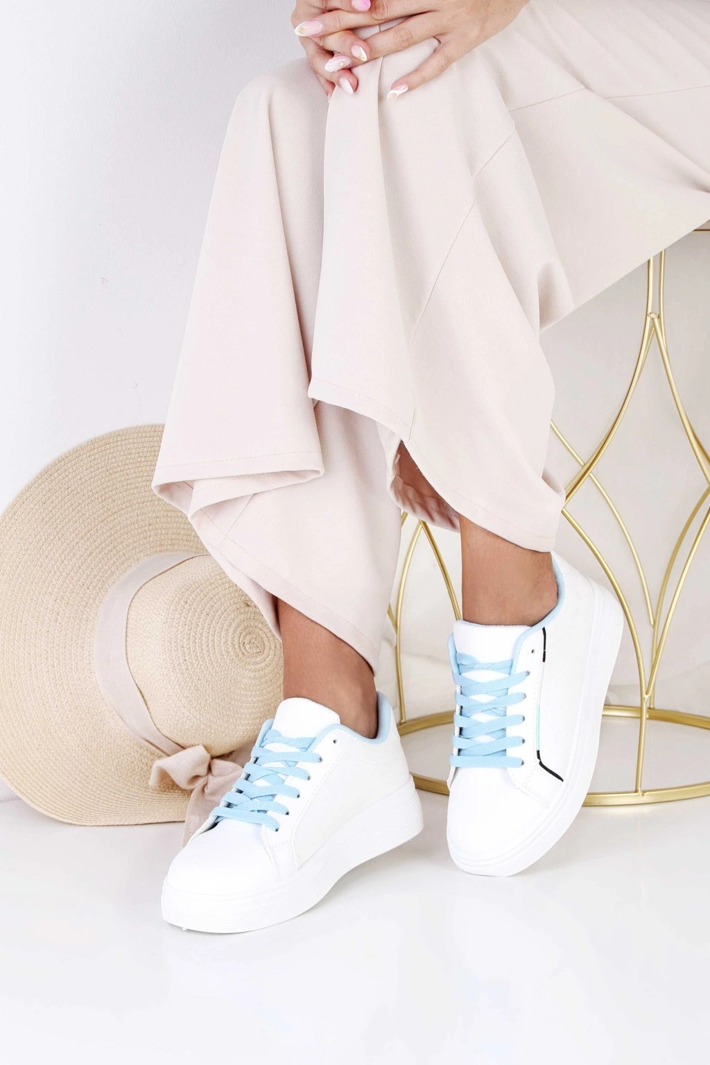 Te damskie sneakersy to klasyczny, codzienny model o niskiej cholewce. Biała cholewka została uzupełniona błękitnymi sznurówkami i delikatnymi akcentami, które dodają całości świeżego charakteru. Buty mają grubsza, jednolitą podeszwę, która optycznie wysmukla sylwetkę i zapewnia stabilność podczas chodzenia. Sznurowanie pozwala łatwo dopasować obuwie do stopy. To uniwersalna propozycja do miejskich stylizacji, która dobrze wygląda zarówno z jeansami, jak i sukienką.