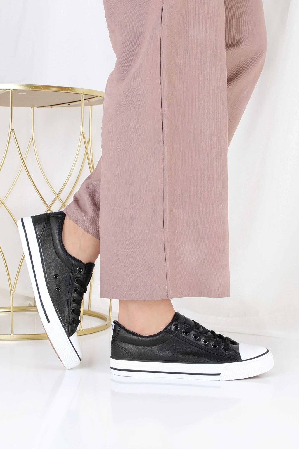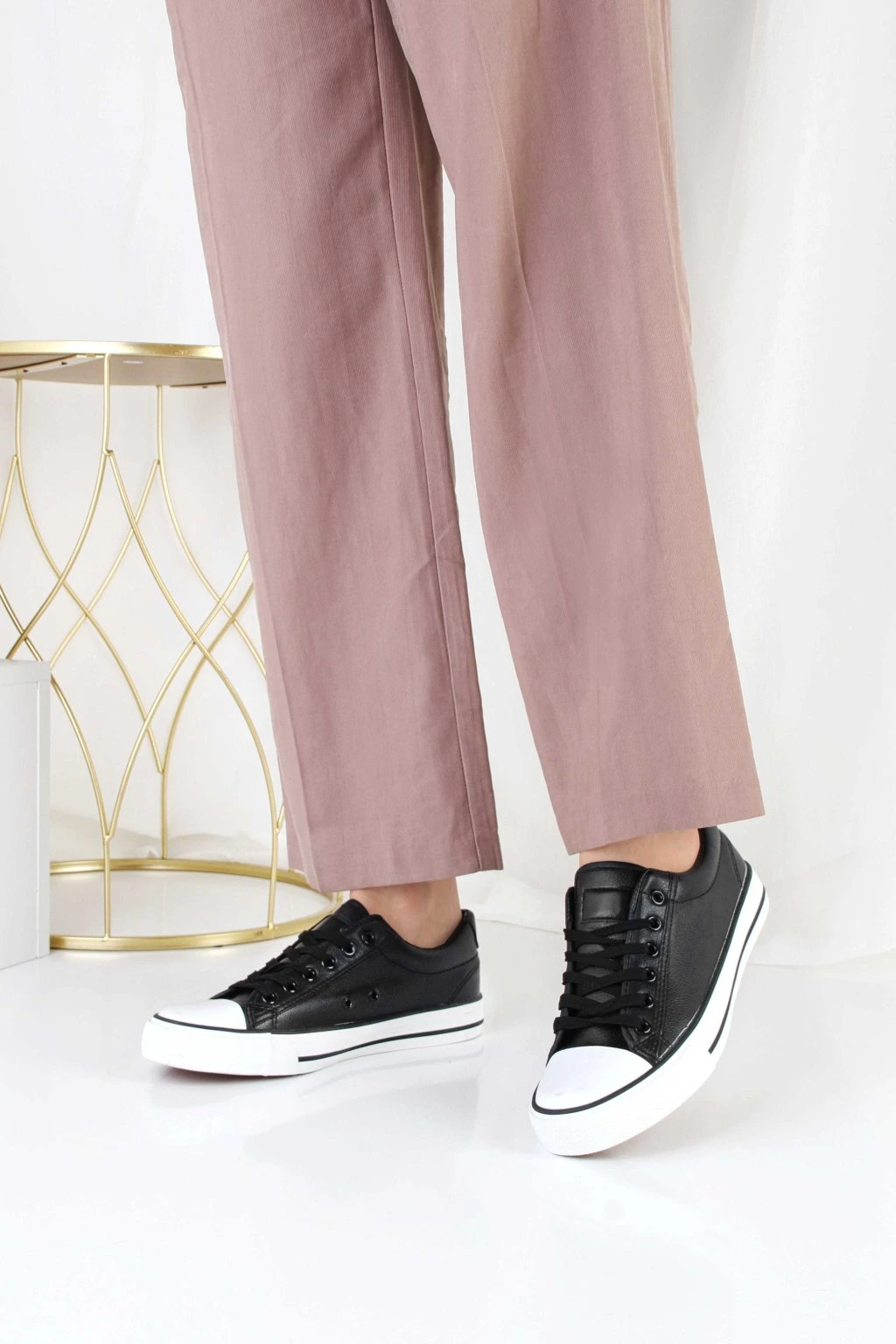 Damskie trampki o klasycznym, niskim fasonie w czarnym kolorze. Model ma sznurowanie, które pozwala dobrze dopasować but do stopy. Białe gumowe noski oraz gruba podeszwa tworzą modny, kontrastowy efekt. Cholewka wygląda na gładką i łatwą do zestawienia z codziennymi stylizacjami. To uniwersalne obuwie na co dzień, które sprawdzi się zarówno do spodni, jak i do sukienek.