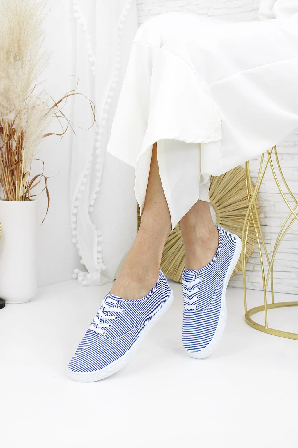 Te damskie trampki przyciągają uwagę klasycznym wzorem w biało-niebieskie paski. Mają niski krój i sznurowanie, dzięki czemu dobrze dopasowują się do stopy. Biała, płaska podeszwa nadaje im lekki, sportowo-casualowy charakter. To wygodny wybór na co dzień, który łatwo zestawisz z jeansami, szortami lub letnimi spodniami. Model świetnie sprawdzi się w miejskich stylizacjach, gdy zależy Ci na prostocie i świeżym, marynistycznym akcencie.