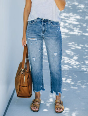 Jeansy długie z postrzępionymi nogawkami – klasyczny stan podkreślający talię – proste lekko luźne nogawki – modne przetarcia – nieregularne nogawki