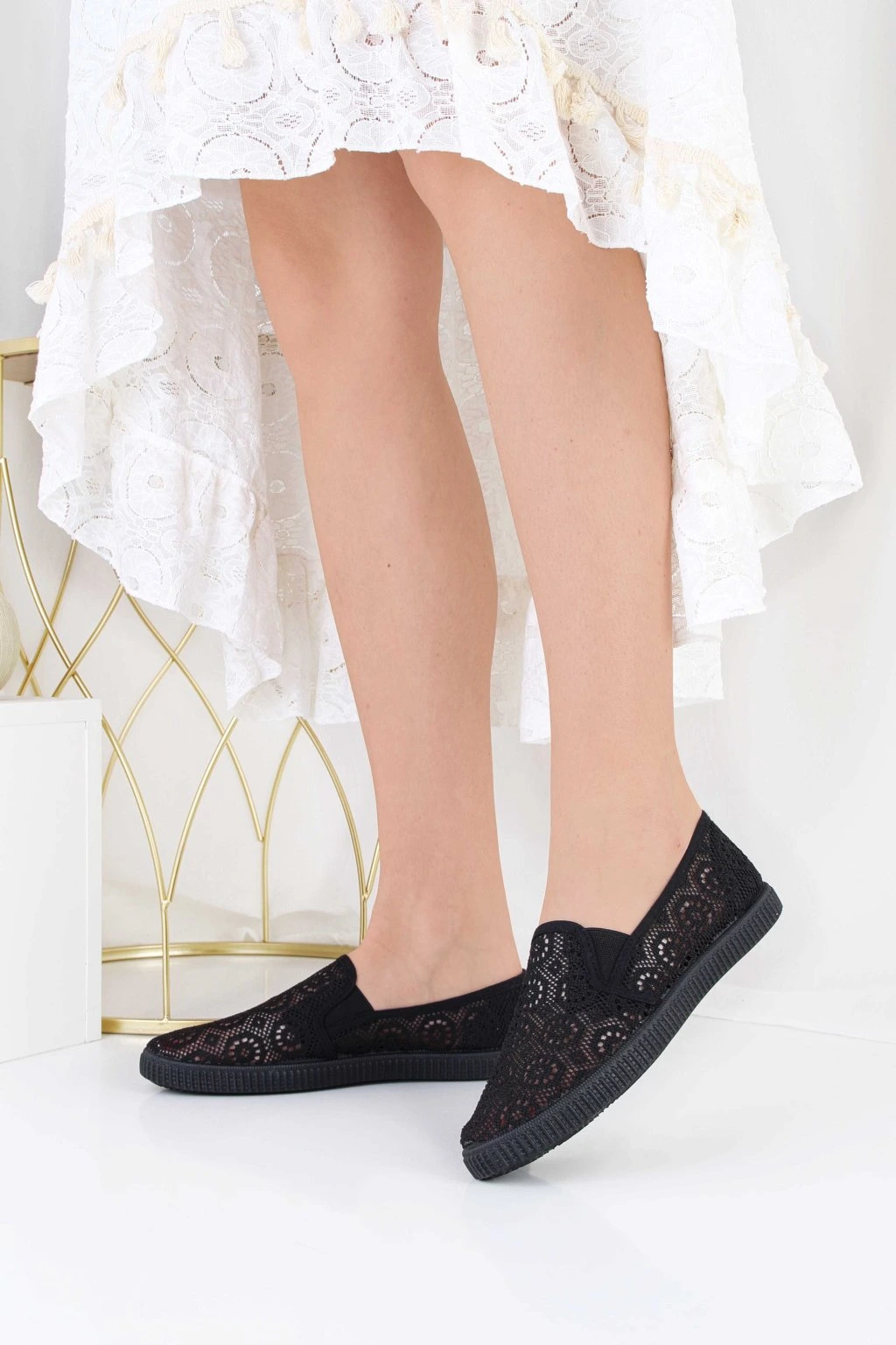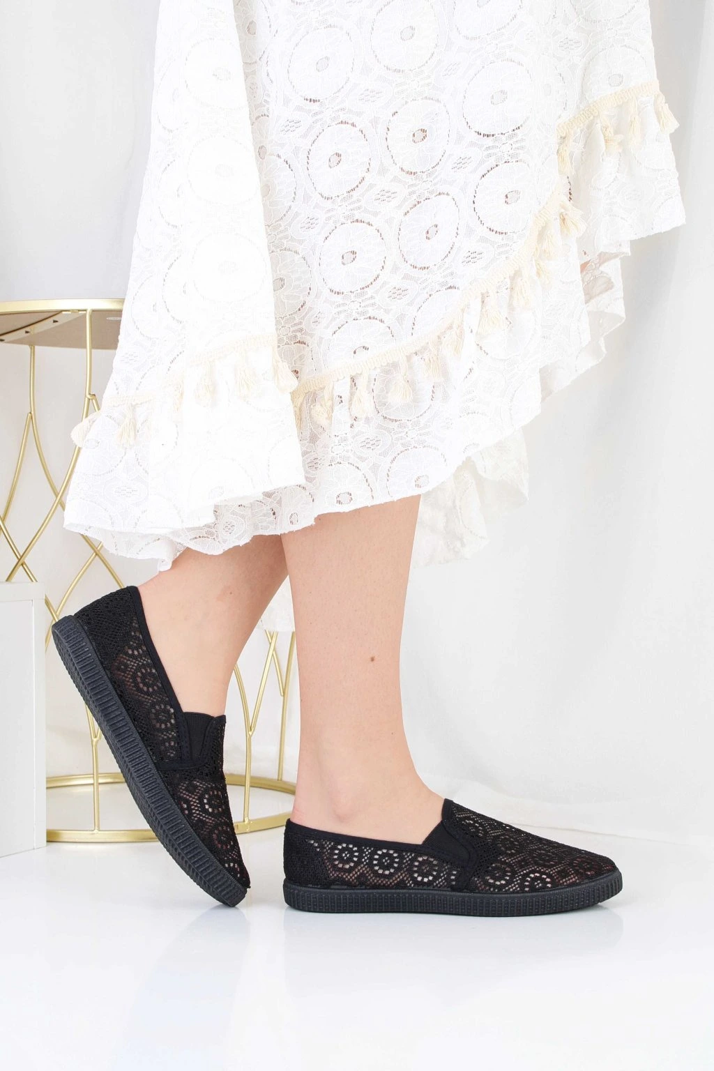 Koronkowe tenisówki typu slip on to wygodna propozycja na co dzień. Cholewka z ażurowej koronki nadaje butom lekkości i subtelnego, kobiecego charakteru. Wsuwana konstrukcja ułatwia szybkie zakładanie i zdejmowanie. Elastyczne wstawki po bokach dopasowują się do stopy i stabilizują ją podczas chodzenia. Model osadzono na płaskiej, gumowej podeszwie, która sprawdzi się podczas codziennych spacerów i miejskich aktywności.