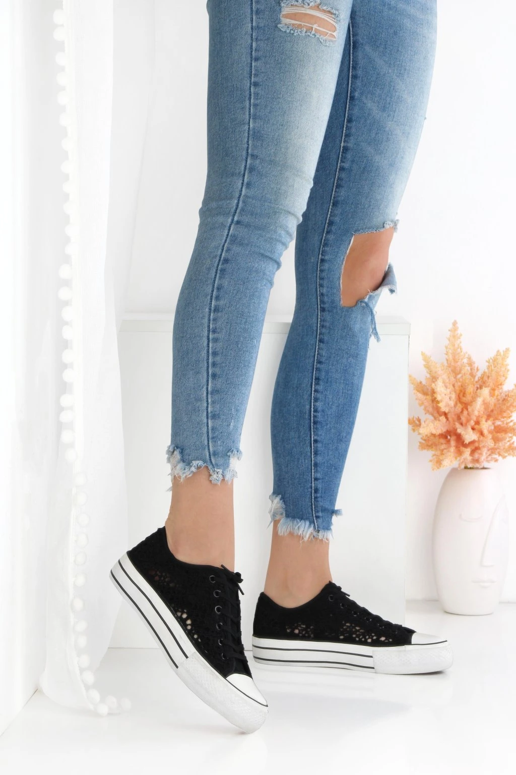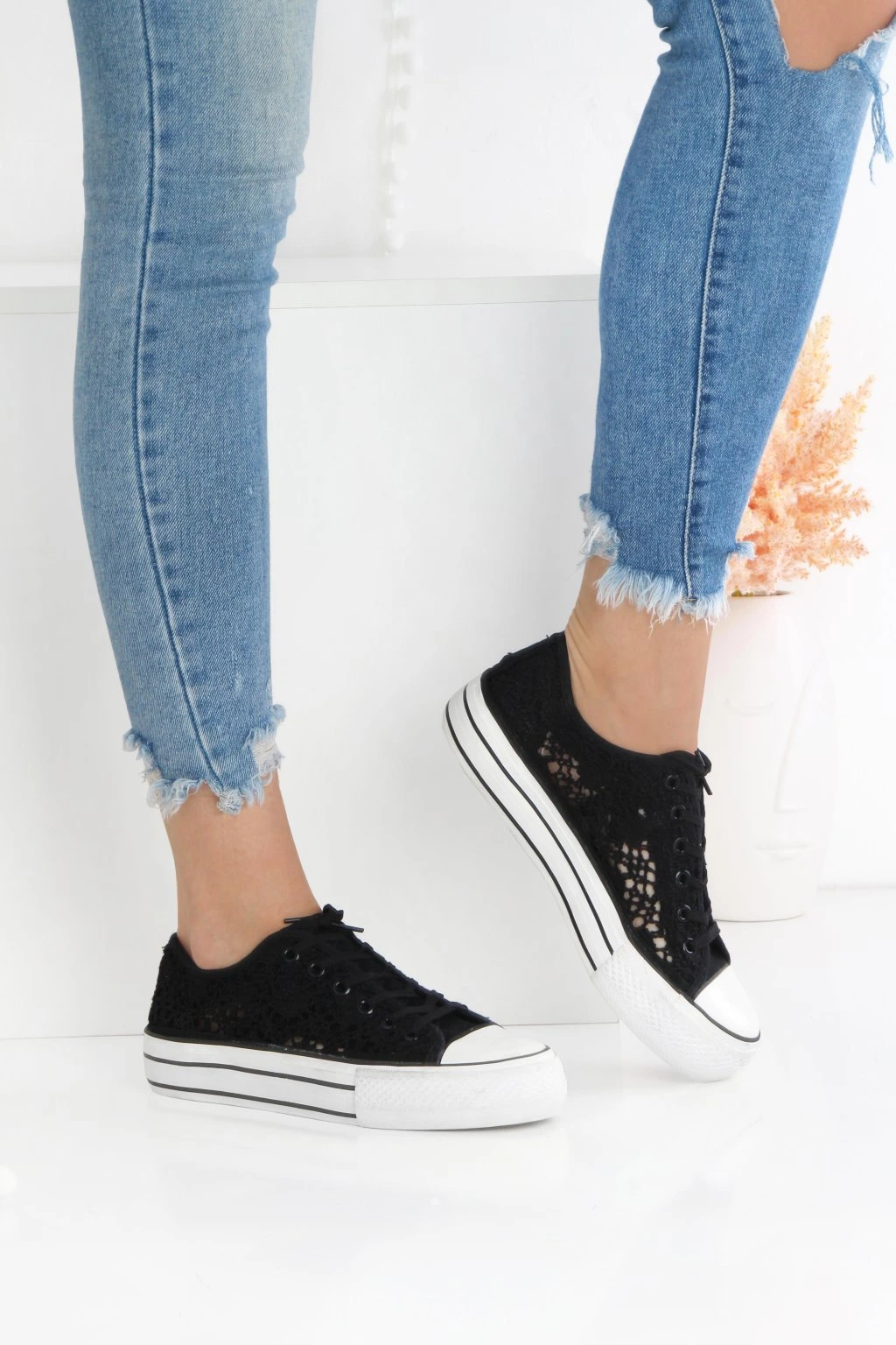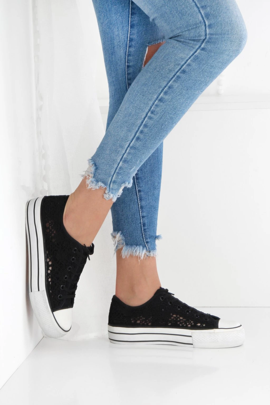 Stylowe trampki na platformie wykonane z ażurowej, koronkowej cholewki. Model ma klasyczne sznurowanie, które pozwala dobrze dopasować but do stopy. Gruba, podwyższona podeszwa w białym kolorze z czarnymi paskami nadaje nowoczesny wygląd i optycznie wydłuża nogi. Niski fason sprawdzi się w codziennych stylizacjach, szczególnie do jeansów i sukienek. Kontrastowy nosek i podeszwa podkreślają sportowy, miejski charakter obuwia.