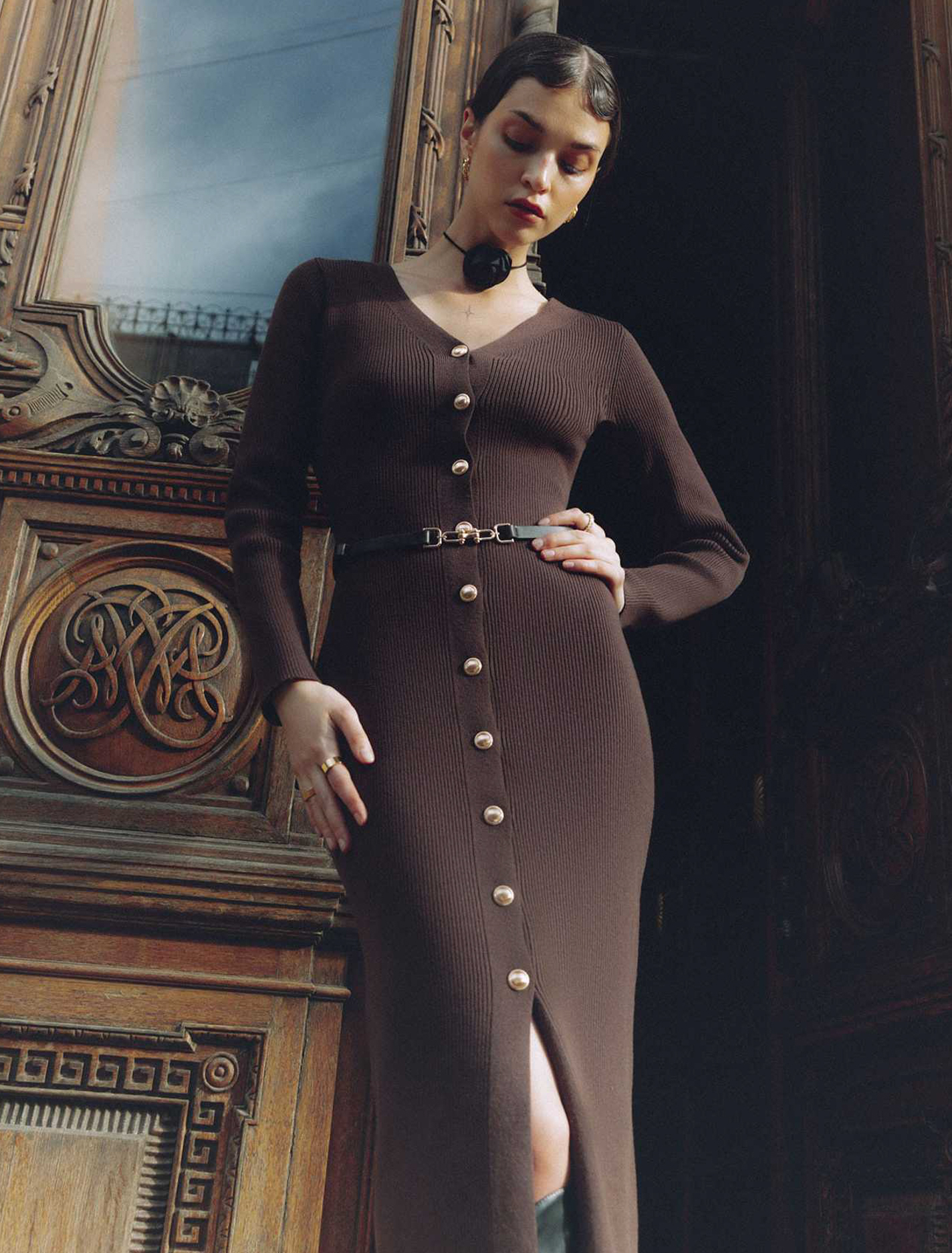 Dopasowana sukienka maxi z długim rękawem i guzikami to klasyczna propozycja na chłodniejsze dni. Guziki wzdłuż sylwetki dodają jej subtelnych detali, a dopasowany krój podkreśla kobiece kształty. Idealna na formalne spotkania i eleganckie wyjścia.