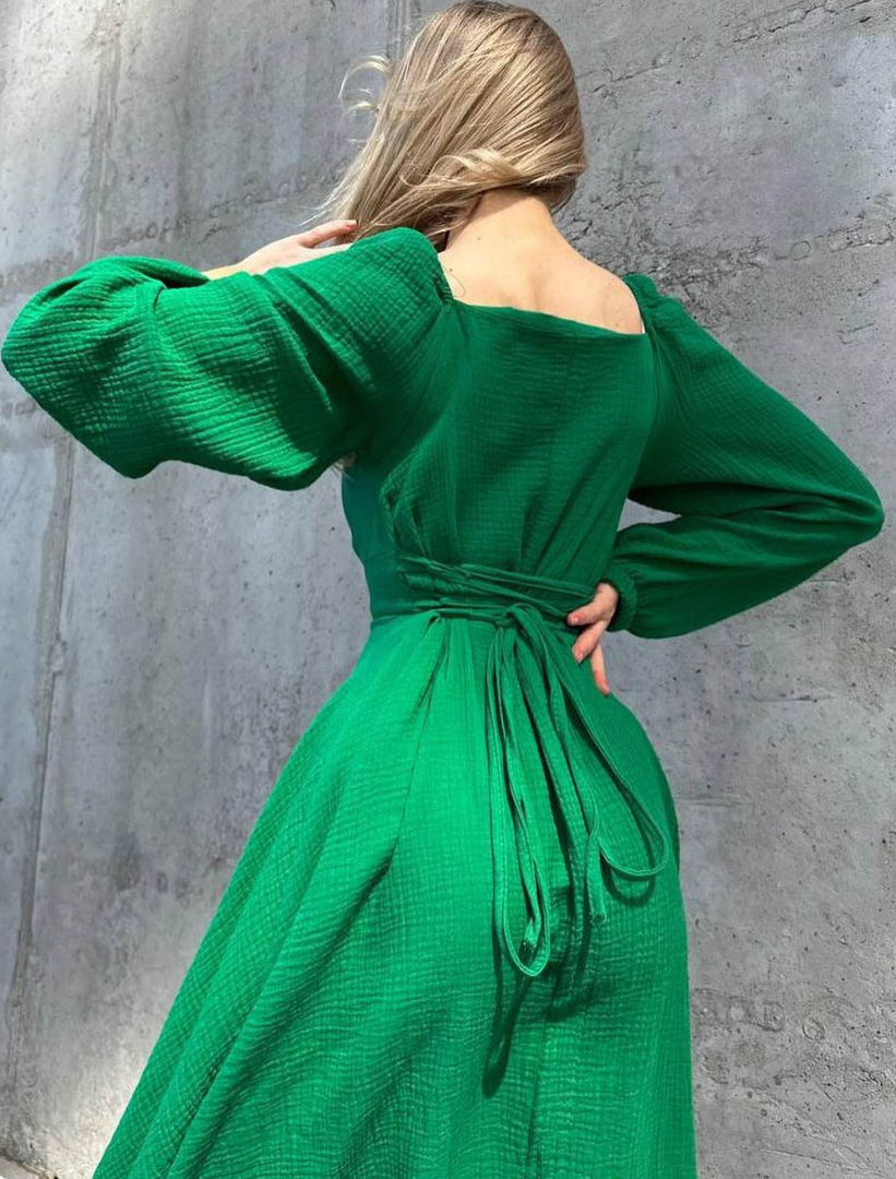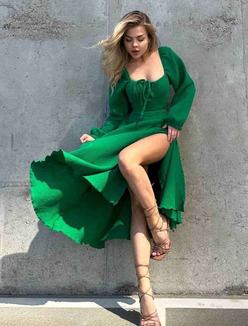 Elegancka sukienka maxi z rozcięciem i wiązanym dekoltem to kobieca propozycja na wieczorne wyjścia. Rozcięcie dodaje lekkości, a wiązany dekolt przyciąga uwagę do górnej części sylwetki. Idealna na formalne i półformalne okazje.