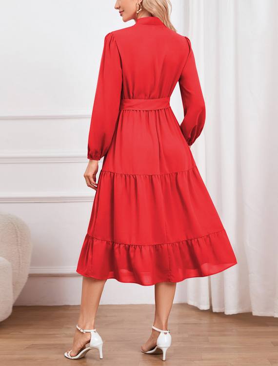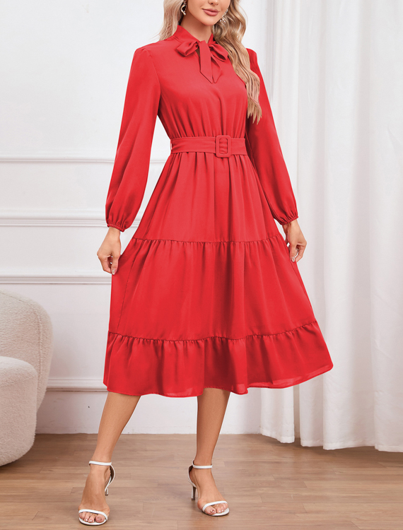 Sukienka o długości maxi z paskiem i kokardą – wiązana pod szyją – z paskiem podkreślającym talię – długie rękawy