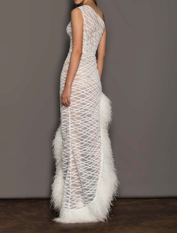 Suknia wieczorowa asymetryczna obszyta piórami