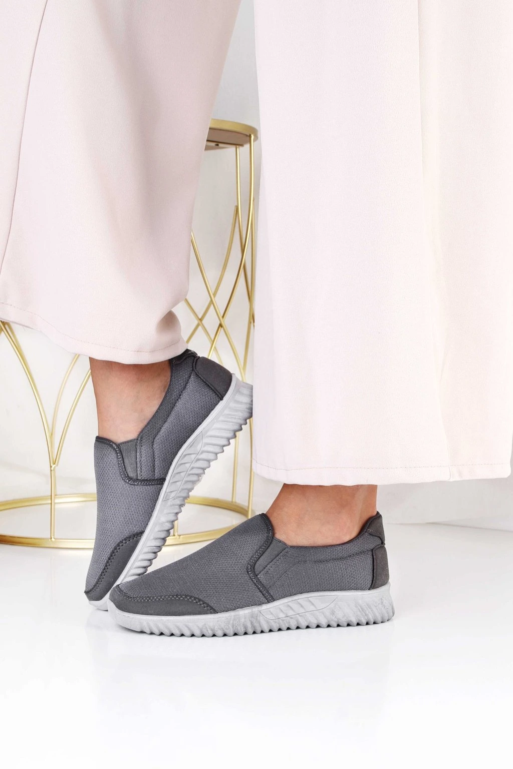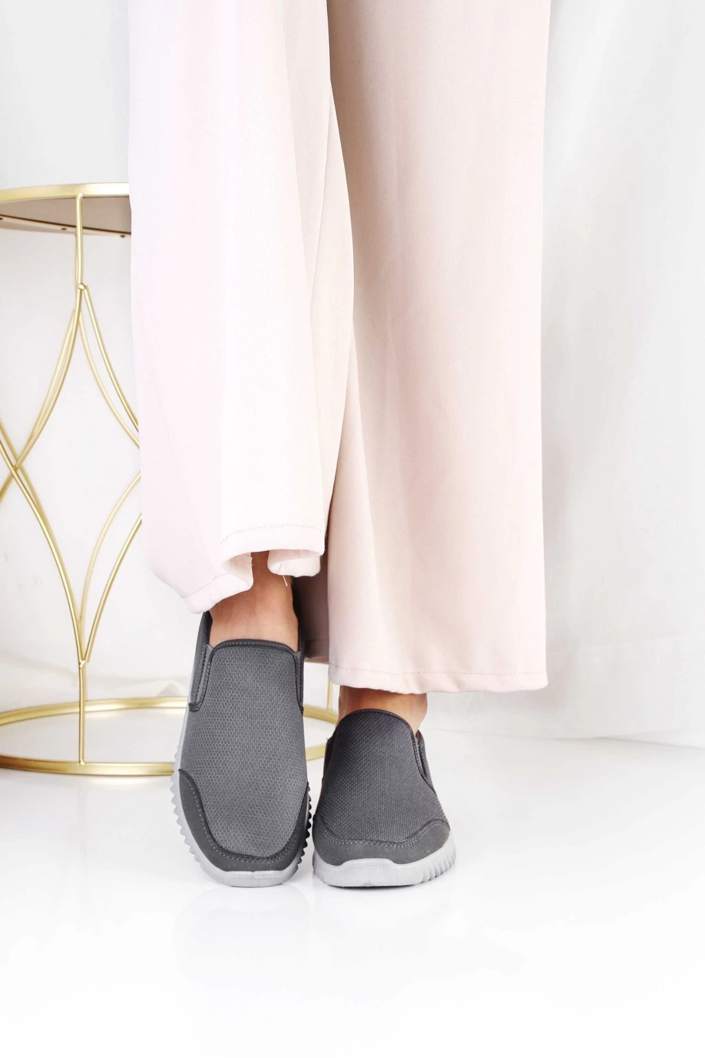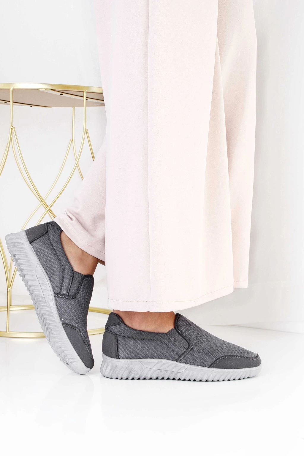 Te szare tenisówki to wygodny model wsuwany, idealny na co dzień. Cholewka wygląda na tekstylną i jest uzupełniona przeszyciami oraz wzmocnieniami na nosku i po bokach. Elastyczne wstawki ułatwiają szybkie zakładanie i dobre dopasowanie do stopy. Grubsza, biała podeszwa o wyraźnym bieżniku dodaje lekkości i zapewnia stabilność podczas chodzenia. Minimalistyczny design sprawia, że buty pasują zarówno do spodni, jak i do bardziej casualowych stylizacji.