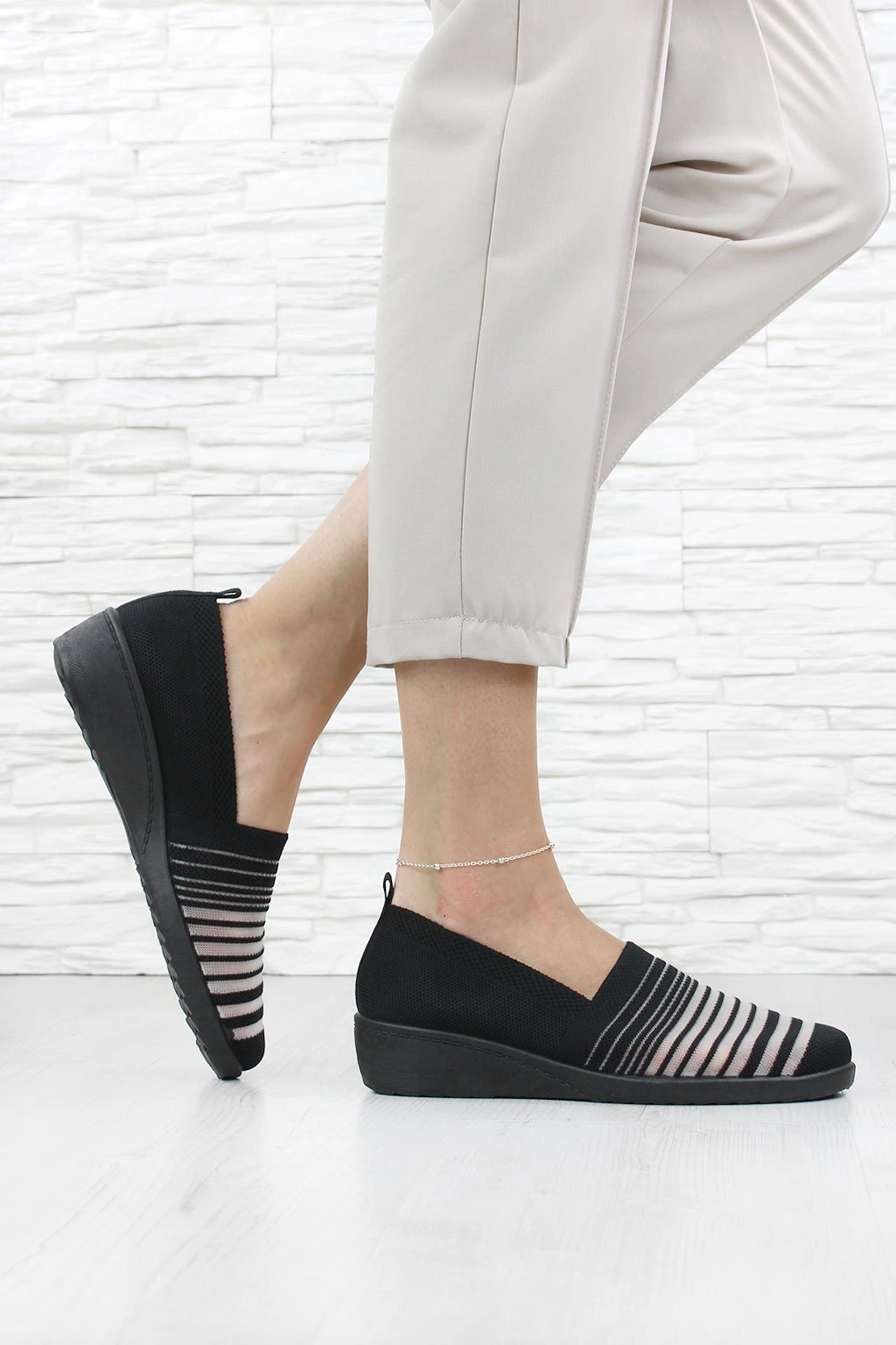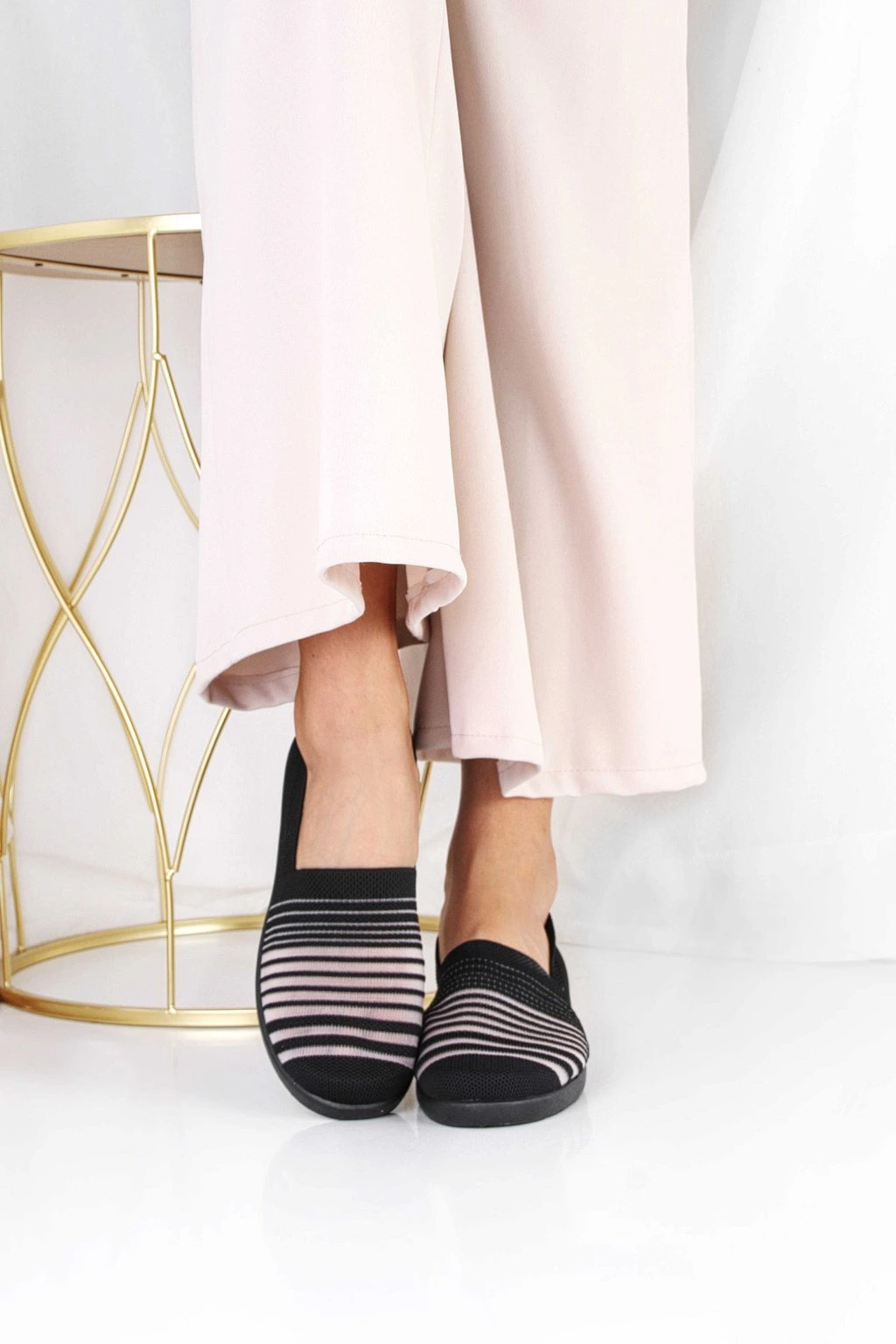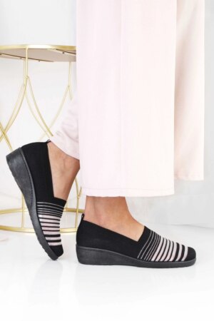 Wsuwane tenisówki na koturnie to wygodna propozycja na co dzień. Cholewka ma sportowy wygląd i jest utrzymana w czerni z kontrastowymi paskami z przodu. Podwyższona podeszwa w formie koturna delikatnie unosi sylwetkę, zachowując casualowy charakter butów. Model łatwo się zakłada i dobrze sprawdzi się w miejskich stylizacjach. To praktyczne obuwie, które można łączyć zarówno ze spodniami, jak i z lekkimi sukienkami.